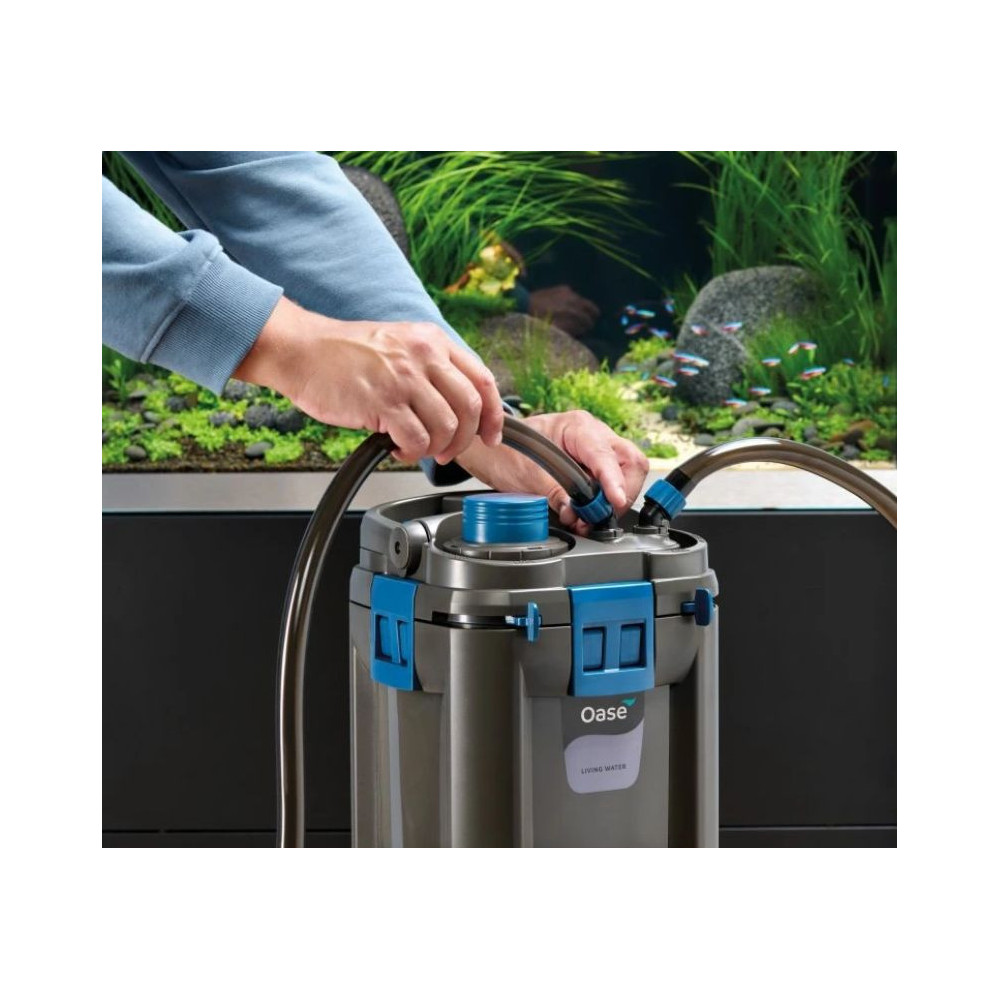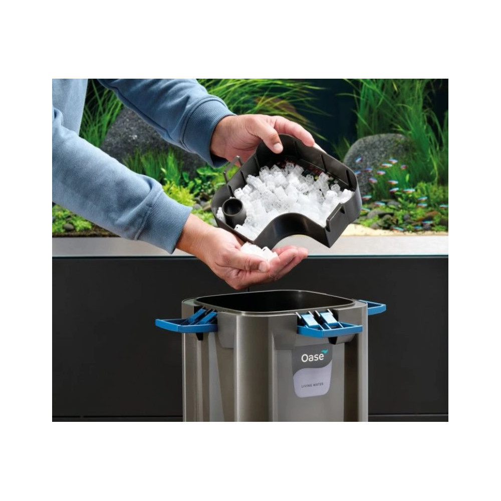 K němu můžete dokoupit také vzduchovací kompresor OxyMax Oase. O pravidelné krmení rybiček se může zase postarat automatické krmítko FishGuard OASE (lze dokoupit). Více pohodlí při nakládání s filtrací BioMaster díky držadlu pro přenášení. Vyvinuto na základě nejpřísnějších požadavků zákazníků – zkonstruováno v Německu. Velký objem filtru s optimálně odladěnou kombinací mechanické a vysoce efektivní biologické filtrace pomoci Hel-X média stejně jako mechanickobiologické čištěni, které zajišťuje zdravou a průzračně čistou vodu v akváriu. Jemný předfiltr o zrnitosti 45 ppi – filtrační pěna pro optimální mechanickou filtraci zbytkových nečistot a delší dobu životnosti biologických medií. Bezpečnost zajišťuje automatické vypnuti a bezpečnostní zamykací mechanismus, který chrání před nežádoucím únikem vody, například při čištěni předfiltru.