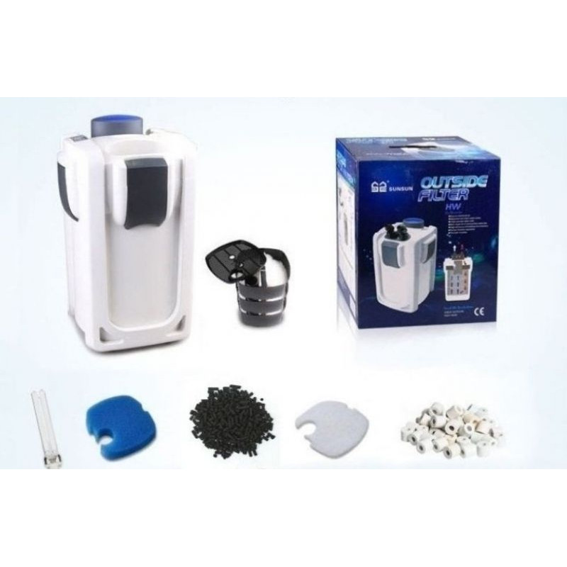 SUNSUN HW-702A vnější filtr 1000 l/h připravený k okamžitému spuštění. Koše jsou již naplněny filtračními materiály jako je biomolitan, vata či keramické kroužky.