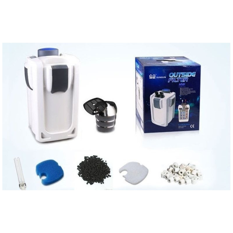 Akvarijní filtrace SUNSUN BHW-702 B s UV lampou 9W pro akvária 90 - 300l. Filtr s UV lampou BHW-702 B čistí vodu mechanicky a biologicky. UV lampa zabudovaná ve filtru účinně hubí patogenní organizmy a shlukuje řasy do větších celků, která dokáží zachytit filtrační hmoty. Externí filtr využívá sedimentace vody, mechanické filtrace a bakterií v bio-materiálech, které mohou oddělit a rozložit škodlivé látky. Filtrace je vhodná pro filtrování vody v akváriích a speciálních chovných nádržích.
