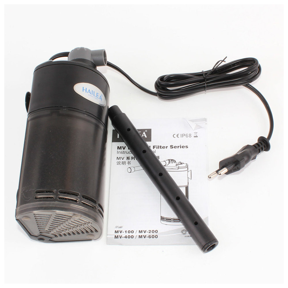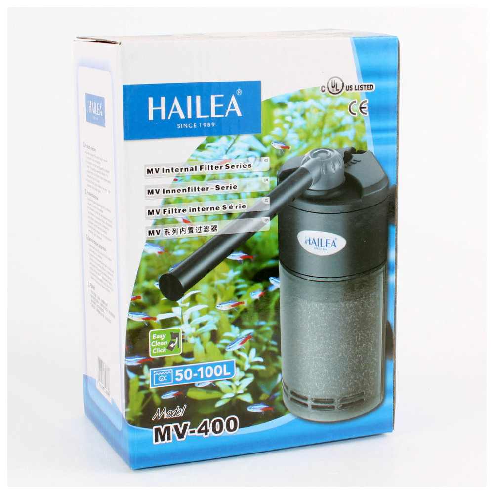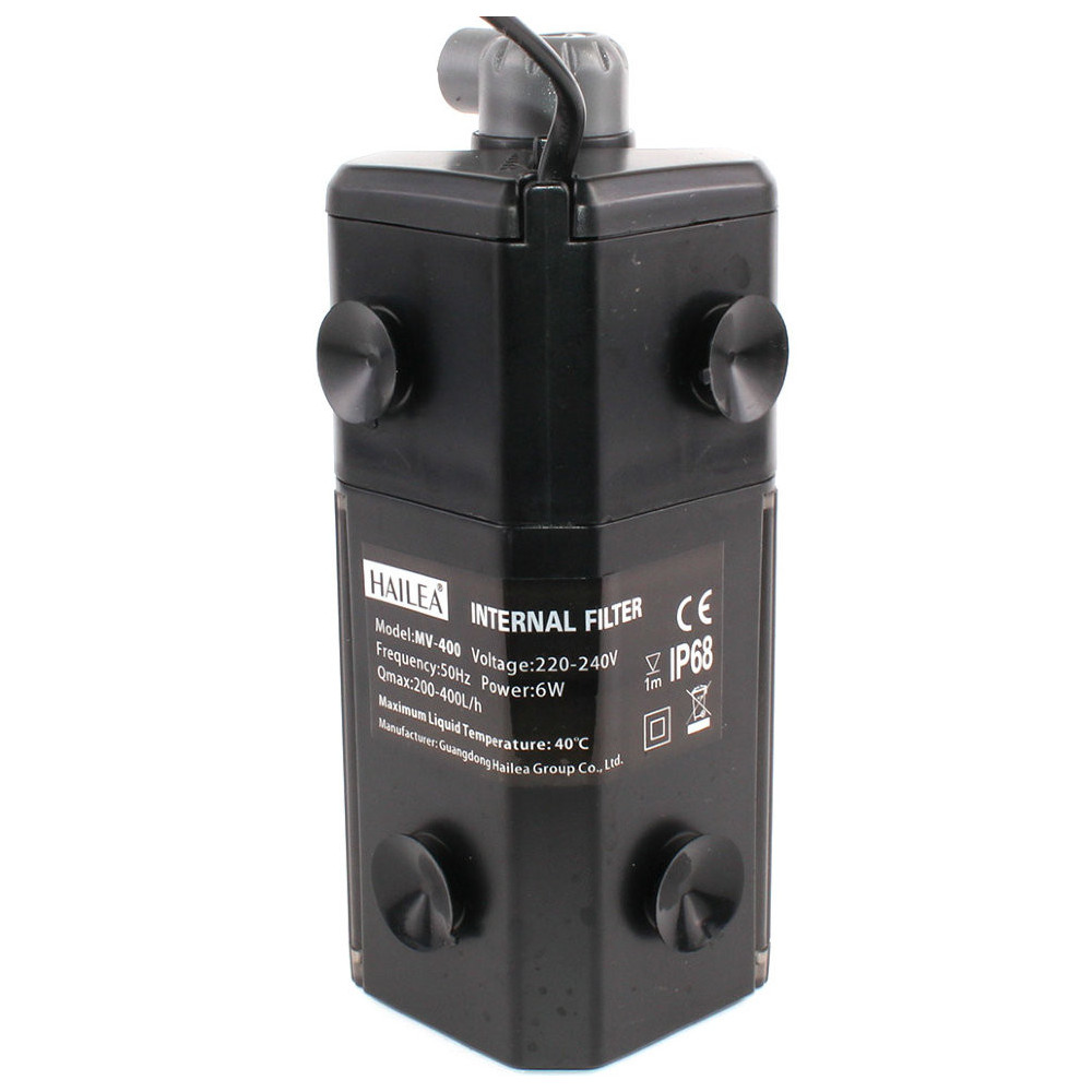 Rohový vnitřní akvarijní filtr Hailea MV-400 zajišťující mechanické, biologické čištění a kyslík v akváriích 50 - 100 litrů, se spotřebou energie 6W. Hailea MV-400 je vybaven kromě filtračního materiálu s houbičkou také rozstřikovací trubičkou. Výhodou je možnost regulace výkonu. Rohový filtr MV-400 lze instalovat dvěmi způsoby. V prvním případě je rozstřikovac trubka nad hladinou a samotný filtr celý pod vodou. V dalším případě se nachází celý filtr pod vodou včetně výstupu.