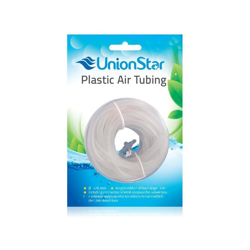 Unionstar silikonová vzduchovací hadička 3m dlouhá s plastovou spojkou (konektorem) pro vzduchovací motorky nebo hnojení CO2. Ohebná a odolná hadička 4/6 mm. Je 100% elastická. Netvrdne. Použitelná i pro rozvody CO2.
