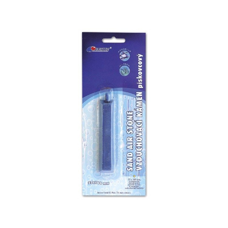 Vzduchovací kámen 10cm dlouhý s plastovou nátrubkou. Je vyroben z porézního materiálu, který umožňuje proudění vzduchu skrz sebe. Když je vzduch přiváděn z vnějšího zdroje (pomocí vzduchového kompresoru nebo vzduchové pumpy), vytváří se víření vody, což způsobuje rozpadání bublin.