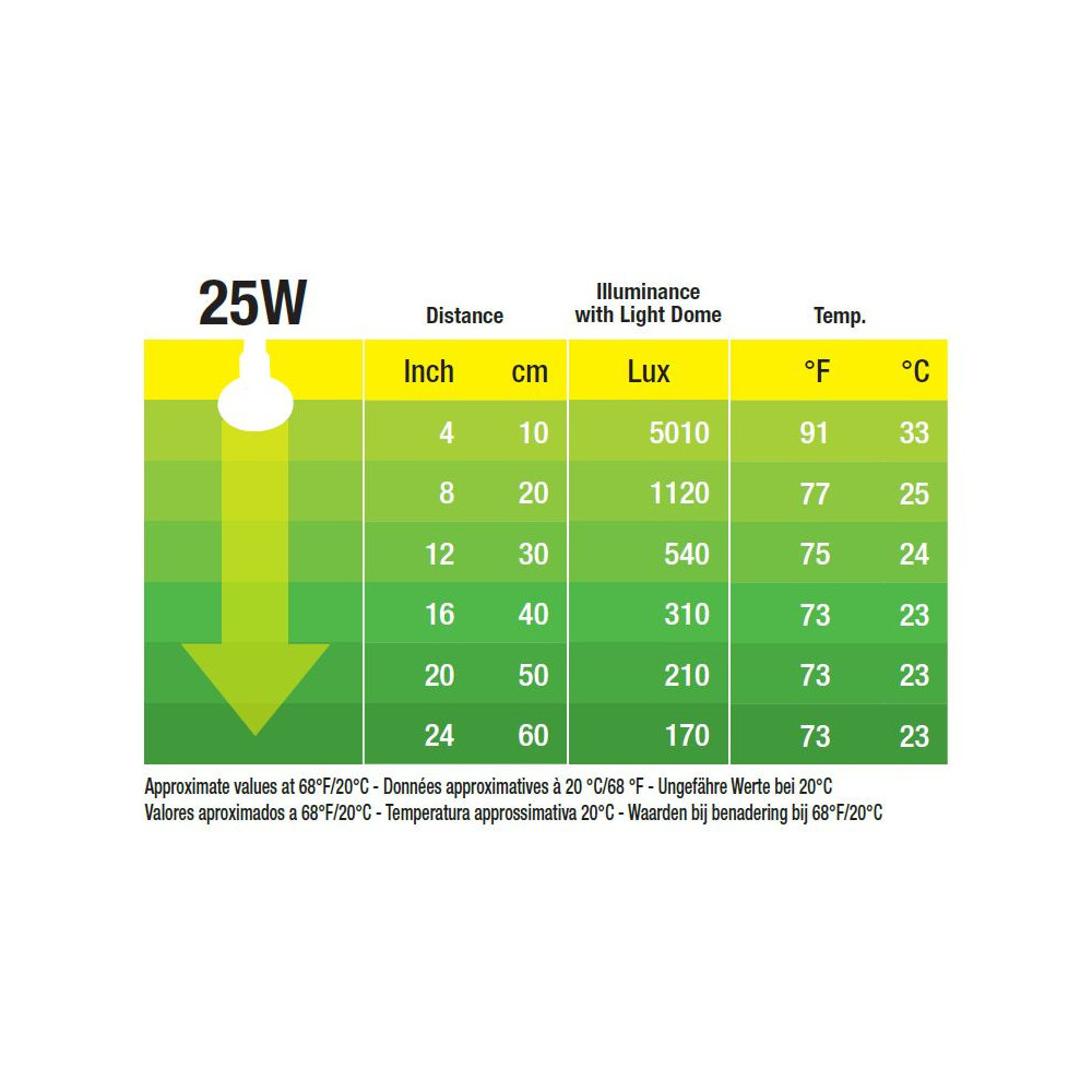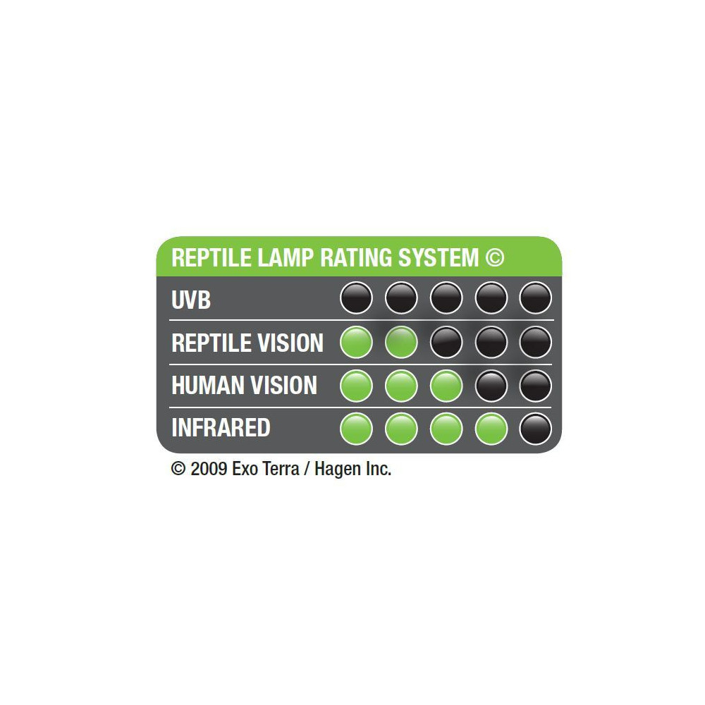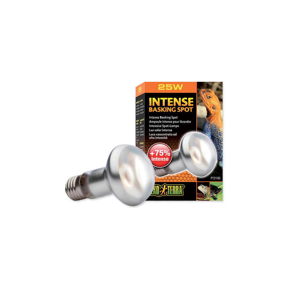 ExoTerra terarijní žárovka Intense Basking Spot 25W je výhřevná žárovka 35% nárůstem světla a tepla pro terária. Terarijní reflektorová žárovka pro plazy Intense Basking Spot vyhřívá prostor pro termoregulaci, zvyšuje teplotu okolního vzduchu. Žárovka je speciálně navržena jako vyhřívací lampa. Paprsek může být zaměřen na plochu a vytvořit vyhřívají místo. Teplo a světlo v paprsku se zvyšuje o 35%, což umožňuje větší vzdálenosti mezi žárovkou a vyhřívanou plochou. Lze kombinovat s lampou Night Infrared Heat nebo Basking Spot v 24hodinovém cyklu. Spektrum je ideální pro fotosyntézu rostlin a UVA (ultrafialové) záření přispívá k fyziologické pohodě plazů. Kombinovat můžete např. s žárovkami s měsíčním světlem jako je Night Heat 25W