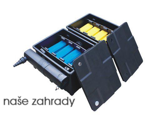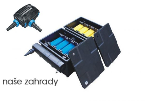 Gravitační filtrační sada ACBF 350B s 24 W UV lampou a čerpadlem 12000 l/h do 60 000 l. Set jezírkové průtokové filtrace pro jezírka do objemu 60 000 litrů s 24 W UV lampou a, čerpadlem CTF 12 000 l/h a hadící. S účinnou více stupňovou bio jezírkovou filtrací a jednoduchým provozem. Pro umístění na břehu jezírka s volným výtokem vody z filtrace zpět do vodního systému.