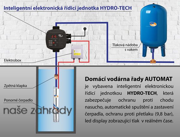 Inteligentní vodárna s ponorným čerpadlem SUB CONTROL 80 A-Tec Automat, nádoba 80 litrů, max. 4500 l/h a řídicí jednotkou HYDRO-TECH s integrovaným LCD led displejem s jednoduchým nastavením zapínacího a vypínacího tlaku a intuitivním ovládáním.