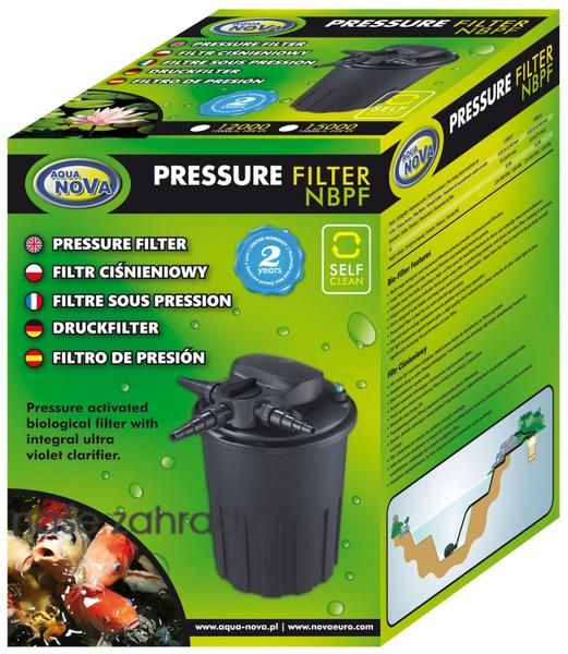 Filtrační set do jezírka AquaNova NBPF-12000 s UV lampou 18W a čerpadlo PondoVario 3400 l/h, to je sada tlakové jezírkové filtrace. Tlakový jezírkový set nabízí spolehlivé a ekonomické čištění jezírka do objemu 12000, s rybami 6 m3, s KOI 3 m3. Jezírková filtrace čistí vodu biologicko mechanicky. UV zářič likviduje patogenní bakterie a plovoucí řasy. Voda protéká několika vrstvami filtračních hmot a zpátky vytéká čistá do rybníčku nebo jako prameniště potůčku a vodopádu. Jezerní filtr je vybaven trojcestným ventilem pro snadné čištění, aniž by jste museli filtr otevírat. Pouze přepnete přepínač na čištění a Vaše jezírkové čerpadlo již propláchne filtr bez nutnosti jeho otevírání. Filtr s čerpadlem lehce propojíte pomocí spirálové hadice, které také naleznete na našich stránkách - hadice 32mm.