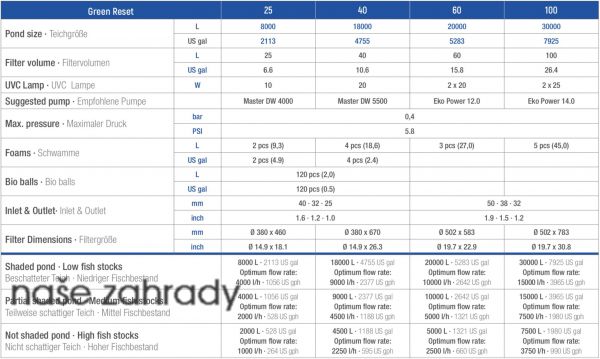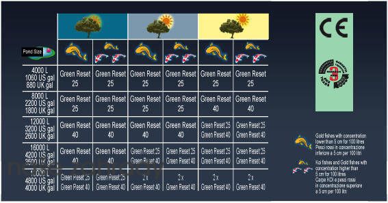 Filtr je vhodný pro jezírka do 16 000 litrů umístěné téměř ve stínu. V případě jiného umístění a zarybnění se orientujte podle tabulky uvedené pod obrázky.