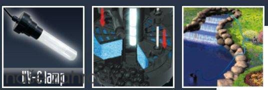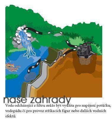UV-C lampa zničí nežádoucí bakterie, řasy a jiné mikroorganismy. Voda je přefiltrována přes několik vrstev filtračního materiálu a z filtru vytéká čistá zpět do jezírka nebo na vrchol potůčku nebo vodopádu do výšky více jak 1 m. Filtr je vhodný pro plně osluněnou nádrž s rybami včetně Koi kaprů