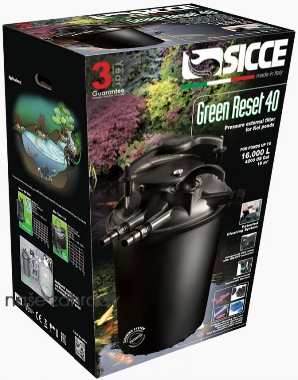 Spolehlivá filtrace pro jezírka Sicce Green Reset 40 s UV lampou je velký tlakový jezerní filtr a vestavěná UV lampa pro okrasný zahradní rybníček o objemu do 16 m3 bez ryb, s rybami do 12m3, s možností chovu Koi kaprů (pro objem do 8 m3). Samozřejmě záleží na oslunění nádrže, výkonu čerpadla, množství ryb - viz. tabulka v detailu. Jezírková filtrace Green Reset 40 a UV lampa 20W včetně UV-C zářivky. Tlaková filtrace pro jezírko pracuje na principu biologicko mechanické filtrace.
