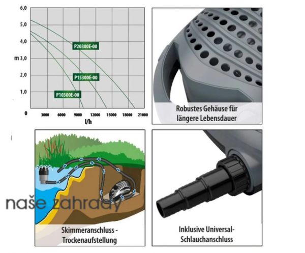 Výkon čerpadla si můžete přizpůsobit podle potřeby jezírka, například zvyšte výkon pro filtraci v létě, snižte výkon na jaře a na podzim. Upravte si přísun kyslíku do Vašeho jezírka dodávaný vodopádem, na časovači nastavte přes den výkon 50 %, přes noc 10 %. V případě potřeby si individuálně nastavte výkon pro vodní hry. Díky regulaci výkonu a spotřeby ušetříte za energie. Robustní tělo zajišťuje dlouhou životnost jezírkového čerpadla a umožňuje průchod nečistot až do průměru 10 mm. čerpadlo lze uložit jak ve vodě Hadicová přípojka má 3 úrovně, takže lze připojit hadici o průměru 25 – 32 - 38 mm (1" - 1 1/2")