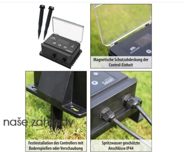 Externí ovladač lze umístit do trávníku pomocí zemních hrotu nebo přišroubovat ke stěně pomocí nástěnného držáku.
