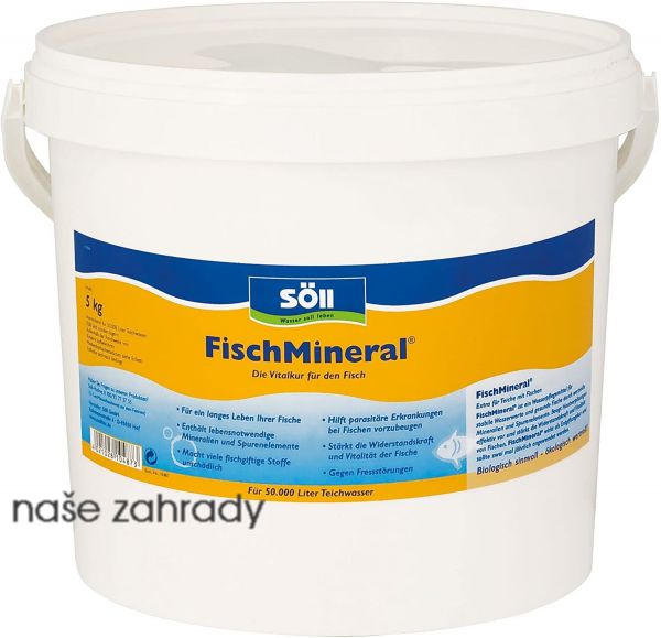 Přípravek k ošetření vody FischMineral v zahradním jezírku - minerály pro ryby v zahradním jezírku 50m3. Stejně jako Koi Mineral 5kg nebo FOK Biofactor VL obsahuje důležité minerály a stopové prvky pro dlouhý život ryb. Intenzivně působí proti život ohrožujícím jedovatým látkám, jako je amoniak a nitrit.
