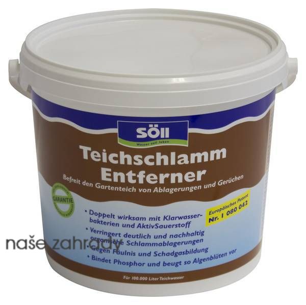 Přípravek k odbourávání kalu Söll TeichschlammEntferner pro 100 m3 - podobné jako Schlamm-ex. PondSludge Remover 5kg působí přírodní cestou proti kalovým usazeninám na dně jezírka. Odumřelé rostliny, listy leknínů a zvláště opadané listí stromů vytvoří na dně jezírka postupem času stále hustší vrstvu kalu. Při jejím odbourávání se spotřebuje kyslík a při jeho nedostatku vznikají jedovaté bahenní plyny a odpadní látky, které vodu silně zatěžují a mohou se stát pro ryby nebezpečnými.