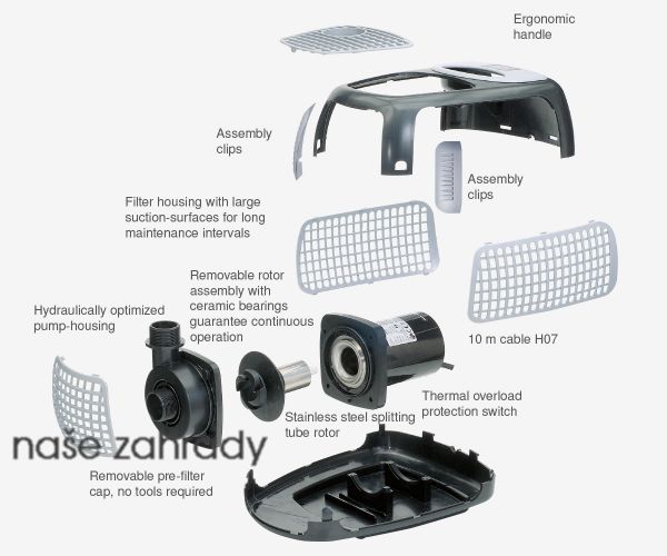 proudění vody VORTEX. Výhodou je, že čerpadlo dokáže přečerpávat i znečištěnou jezírkovou vodu s nečistotami do 8 mm. Jednoduchá demontáž jednotlivých dílů usnadňuje údržbu čerpadla. Čerpadlo je schopné téměř nepřetržitého provozu díky keramickému pouzdru a tepelná pojistce.