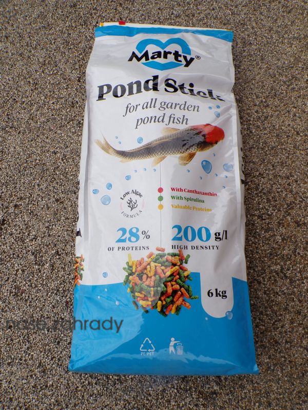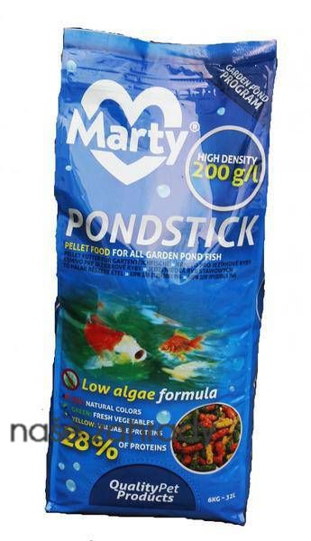Kvalitní tříbarevné krmivo pro jezírkové ryby MARTY PondStick 32 litrů, (6 kg). Peletové krmivo pro ryby v zahradním jezírku typu "Pond Sticks" s největší hustotou na trhu, a to 200 g/l, zatímco ostatní klesají až k 80 g/l. to znamená, že nekupujete vzduch, ale opravdové krmivo. Toto krmení je ideální pro karasy, zlaté rybky, koi kapry a jeseny.