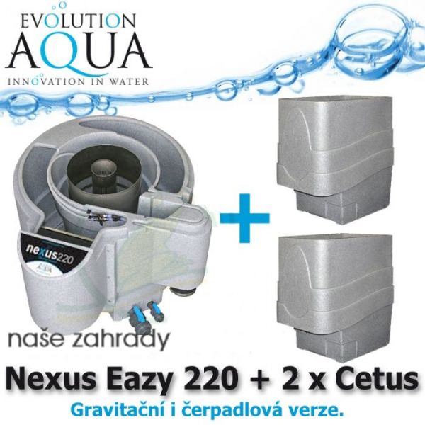 Evolution Aqua Nexus Eazy 220 EAST PLUS (v gravitační i čerpadlové verzi) + 2x mechanický předfiltr Cetus Sieve, filtrace pro koi jezírka a chovy ryb do 70 m3, pro okrasná a biotopy do 210 m3, včetně 18 l K1 Micro a 50 l K1+, 60 měsíců záruka