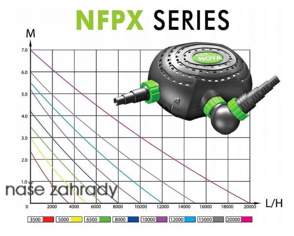 Čerpadlo Aqua Nova NFPX 3500 o průtoku 3500 l/h a spotřebě 14W. Čerpadlo do jezírka NFPX-3500 je energeticky nenáročný model umožňující kromě klasického připojení i napojení na sběrač nečistot NK-50 hladinový skimmer. Jedná se o inovovaný model čerpadla NFPE-3500. Čerpadla NFPX byla vyvinuta pro jezírka na základě požadavků zákazníků. Důraz byl kladen zejména na nízkou spotřebu el.energie, tichý provoz, funkčnost a dlouhou životnost, kterou zajišťuje keramická osička. Čerpadlo je vhodné na napájení potůčuk, na vodopád nebo k připojení na jezírkové filtrace pro zahradní rybníčky.