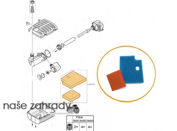 Náhradní set filtračních pěn pro ponorný filtr s čerpadlem a UV lampou Filtral UVC 3000. Filtrační molitany do sady pro malé rybníčky OASE Filtral UVC 3000. Replacement foam set Filtral UVC 3000.