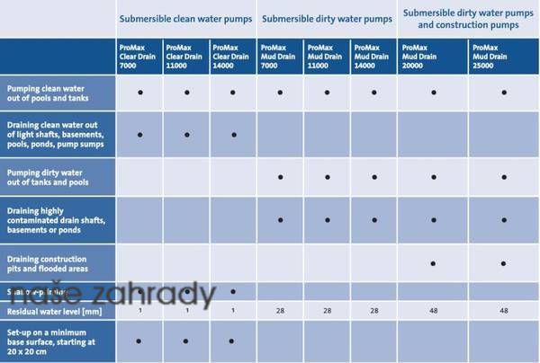 Voda ve sklepě? Nebo si prostě chcete přečerpat čistou nebo kalnou vodu? Žádný problém! OASE ProMax ClearDrain jsou ponorná čerpadla na čistou vodou. OASE ProMax MudDrain jsou ponorná kalová čerpadla a se svými velkoryse dimenzovanými motory, jsou k dispozici k okamžitému použití v různých úrovních čerpaného množství vody. Vysoce dynamickými čerpadly, a to až do 28.000 litrů vody za hodinu, lze spolehlivě přečerpat velké množství vody.