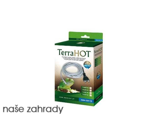 Topné kabely Terrahot jsou určeny pro ohřívání dna v akváriích a teráriích. To jim umožňuje vysoké krytí proti vodě IP 68. Topný kabel pro akvária zajišťuje rovnoměrné ohřátí dna nádrže. Umožňuje se obejít bez tradičního ohřívače či tepelného zářiče. Také může sloužit jako doplňující topení do akvária nebo terária. Hodí se především v akváriích pro pěstování rostlin vytvářejících silné kořenové systémy jako jsou kryptokoryny, žabníky, šípatka, lotosy, … Zlepšením vodní cirkulace na dně posiluje jejich růst a omezuje procesy hniloby. Topný kabel v teráriu zajišťuje teplé podloží, které je důležité zejména při chovu zvířat pocházejících ze stepních a pouštních oblastí. Při použití v teráriu a akváriu se instaluje spirálově na dně. Pro udržení stálé teploty v akváriu nebo teráriu doporučujeme, aby byl kabel připojen na mikroprocesorový termostat. Nepoužívejte v akváriích a teráriích s rybami nebo plazy hrabajícími v podloží a také u chovu zvířat, které mohou překousnout nebo jinak poškodit topný kabel.