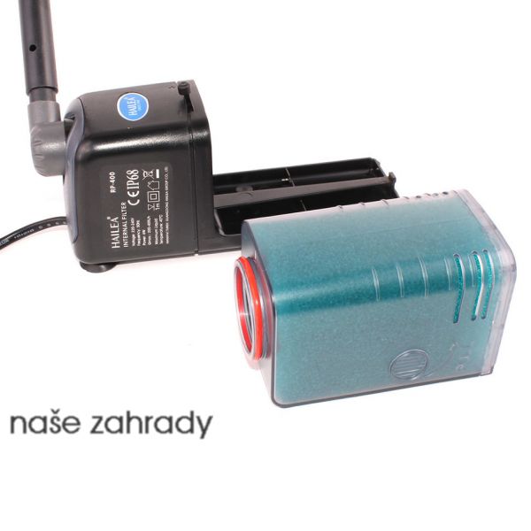 Hailea ponorný filtr RP-400 je vybaven lehce vyměnitelnou kazetou s velkým objemem filtrační hmoty, regulací průtoku a rozstřikovacím difuzérem na výstupu. Tato rozstřikovací trubice reguluje průtok filtrem a rozrušováním hladiny vody v akváriu ji okysličuje.