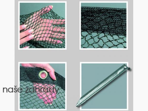 Síť je hustě tkaná z jednoho kusu. Má velice malá oka a tím se stává nenápadnou. Pro jistější ukotvení je síť opatřena po celém obvodu vyztužujícím pásem s kovovými oky. Balení obsahuje praktické kotvící kolíky vyrobené z kovu.