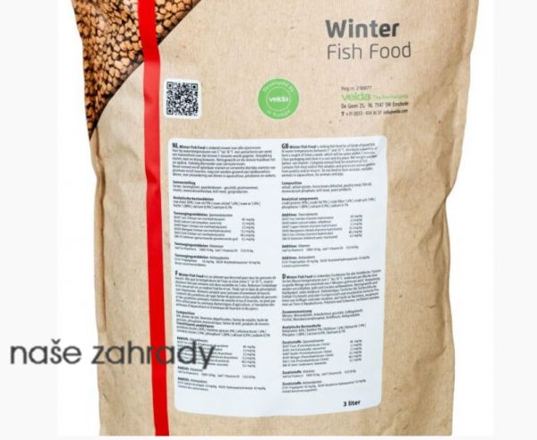 Celoroční a zimní krmivo pro všechny ryby v jezírku včetně jeseterů a sumců 1 litr. Malé granule pro ryby cca 3 mm se pomalu potopí na dno. Zimní krmení pro ryby Winter Food 1000 litr, je speciálně vyvinuté pro krmení v chladném období při teplotách 4 - 10 °C.