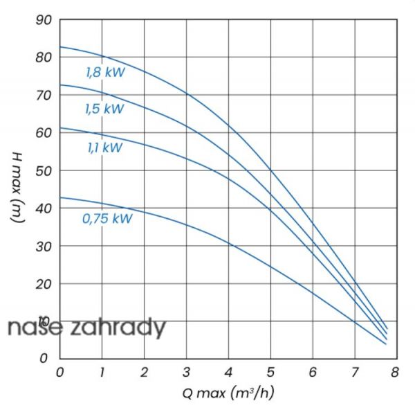 Maximální průtok až 100 l/min (6 m3/h) a výtlak až 65 m, díky čemuž zvládá i hlubší aplikace