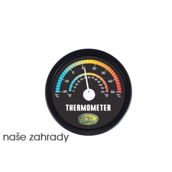 Analogový terarijní teploměr Reptile Nova Thermometer kulatý 7 cm k nalepení pomocí samolepící oboustranné pásky na terárium.
