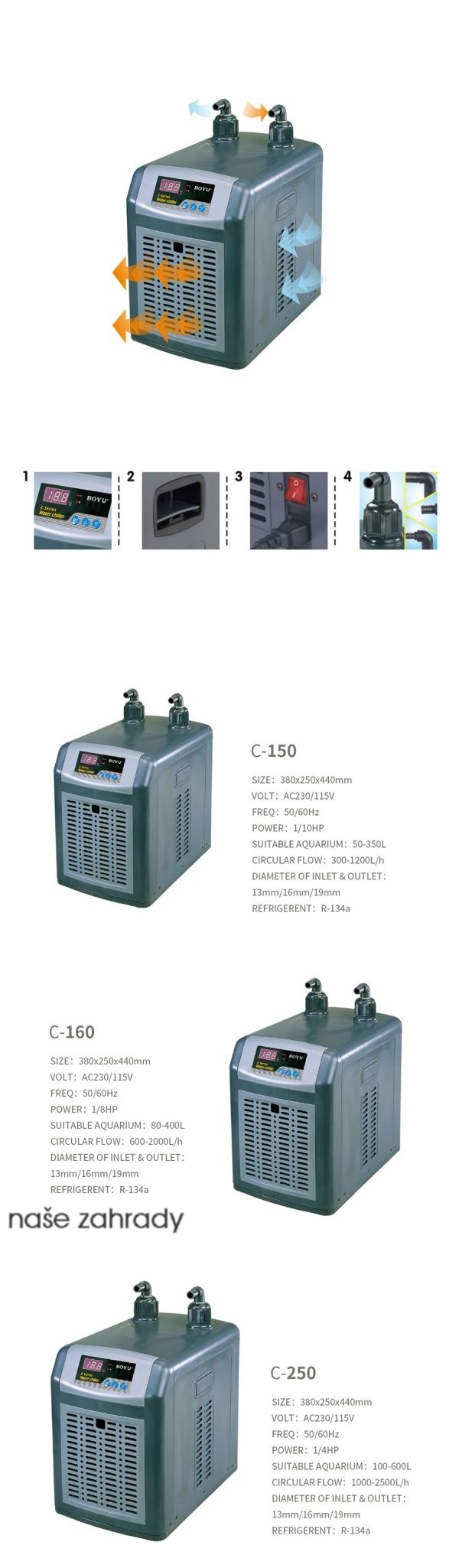 Chladič do akvária Boyu C-160 pro sladkovodní či mořské nádrže s objemem 80-400 litrů. Chladící zařízení C-160 pomůže urychleně snížit teplotu vody z 35°C na 18°C. Chladící systém je řízený mikropočítačem.