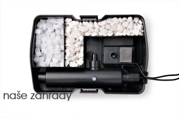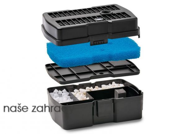 Filtrace: 1x modrá filtrační houba, 180x biologické povrchové prvky, 0,8 kg speciální filtrační granulát