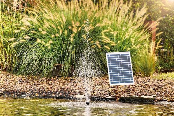 Ponorná filtrace s vodotryskem německé značky Pontec PondoRell 1500 UVC Solar pracuje na sluneční záření. Když je zataženo, může být připojena do sítě.