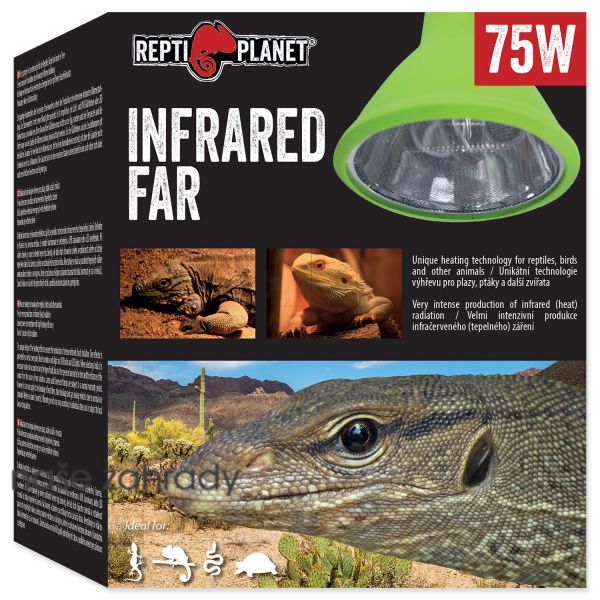 Terarijní žárovka REPTI PLANET Far Infrared HEAT je unikátní konstrukce výhřevného reflektoru zajišťuje produkci intenzivního infračerveného (tepelného) záření. REPTI PLANET Far Infrared HEAT je unikátní technologie výhřevu pro plazy, ptáky a další zvířata. Velmi intenzivní produkce infračerveného (tepelného) záření. Nižší spotřeba elektrické energie při větší efektivitě výhřevu. Neprodukuje světelné záření.
