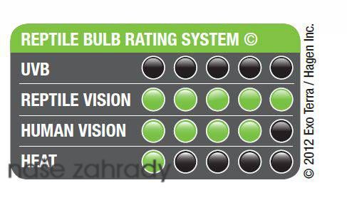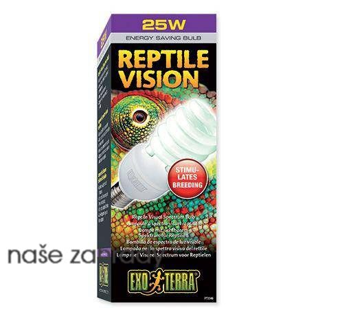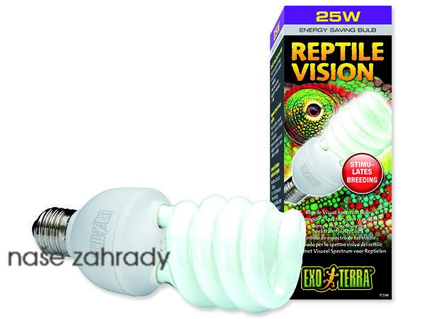 Terarijní žárovka Exo Terra Reptile Vision 25 W s vlnovými délkami, které vnímají oči plazů. Žárovka nabízí ideální spektrum viditelného světla, ideálního pro všechny druhy plazů a obojživelníků. Podporuje chuť k jídlu a chov a zlepšuje u zvířete vnímání svého prostředí. Zlepšuje přirozené chování a je přizpůsobena pro 4 receptory v očich plazů. Tyto žárovky však nestačí na vytápění terária.