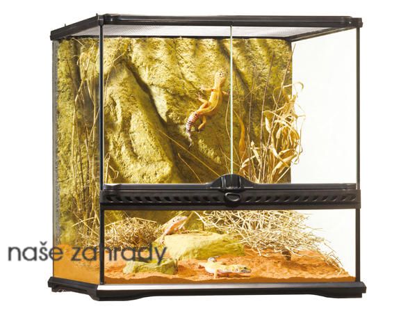 Skleněné terárium s pozadím pro plazy a obojživelníky. Velikost: 45 x 45 x 45 cm.