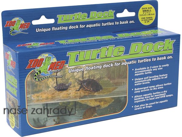 Terarijní plovoucí ostrůvek pro želvy Turtle Dock Zoo Med 10 pro nádrže o obsahu od 25 do 38 litrů vody. Unikátní konstrukce Turtle Dock umožňuje ostrůvku přizpůsobit se kolísání vodní hladiny. Ponorná rampa umožňuje želvám snadný přístup na ostrůvek. Díky této plošince mohou želvy v klidu absorbovat teplo z tepelných zdrojů a potřebné UVA záření. Může být rovněž použit pro vodní mloky a žabky.