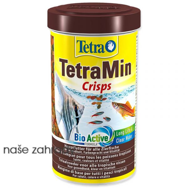 Akvarijní krmivo TetraMin Crisps 500ml s bioaktivní formulí BioActive pro všechny druhy okrasných ryb. Tetra Min Crisps je kompletní krmivo pro zdraví, imunitu, krásné vybarvení a růst Vašich rybiček. Lupínky krmiva jsou vyráběny šetrným způsoběm při nízkých teplotách. Takto je dosaženo vyšších nutriční hodnoty. Potrava pro ryby dlouho plave na hladině a pak pomalu klesá dolů. Proto ho doporučujeme ke krmení smíšených rybích osádek v akvarijní nádrži.