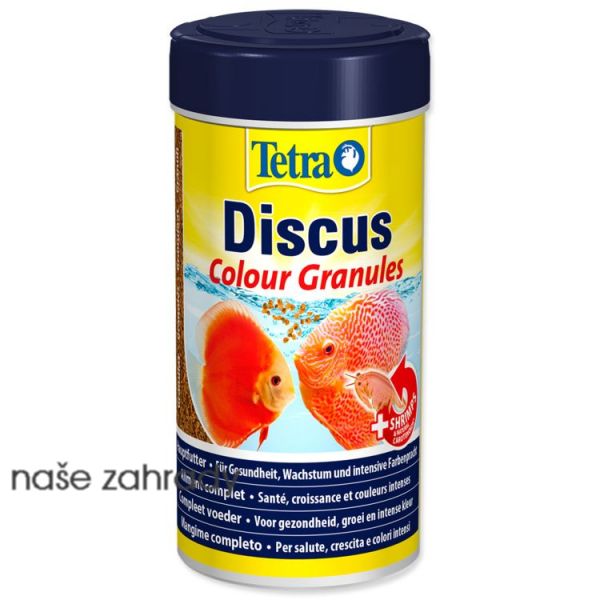 Akvarijní krmení Tetra Discus Color 250ml je krmivo s barvivy účinně posilujícími zbarvení všech plochých ryb s červeným pigmentem. Tetra Discus Color obsahuje pečlivě vybranou směs živin, vitamínů a stopových prvků. Přírodní přísady jako krevety a ančovičky podporují zdravý růst a výbornou chuť krmiva. Granule zajišťují optimální zdraví a kondici ryb. Pomalu klesající ke dnu umožňují přirozené krmení terčovců. Doplňkové krmivo pro červené, hnědé a žluté diskuse. Velikost granulí je vhodná i pro mladé ploché rybky. Obsahuje stabilní množství vitamínu C.