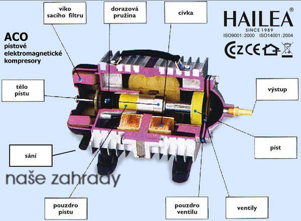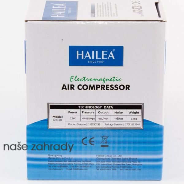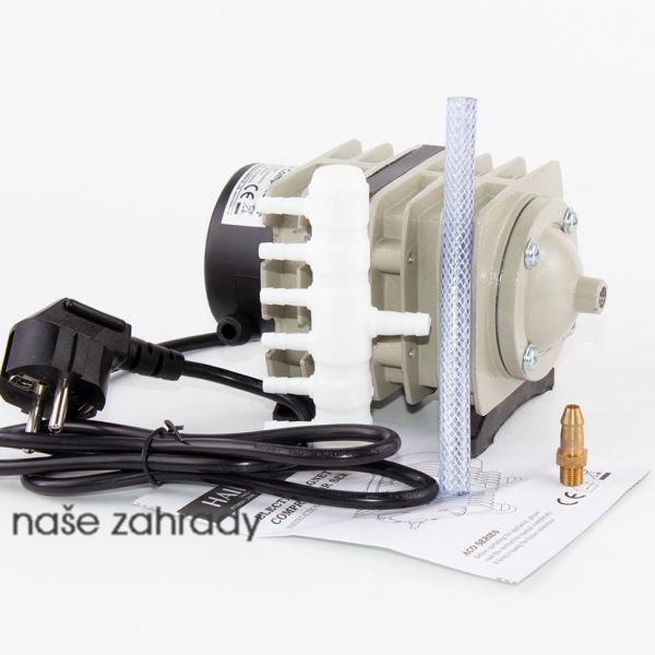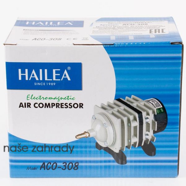 Elektromagnetický pístový vzduchový kompresor ACO 308 Hailea, 2700 l/hod., 20W, je odolné vzduchování do jezírka a akvária. Významné vzduchové čerpadlo ACO-308 pro okysličení vody v zahradních jezírkách a rybníčcích a v akvaristice. Bezolejový pístový kompresor ACO pro jezírko je vyroben z vysoce kvalitní slitiny hliníku ZL 102, nenáročný na provoz. Pístový kompresor Hailea ACO 308