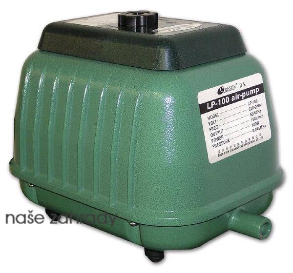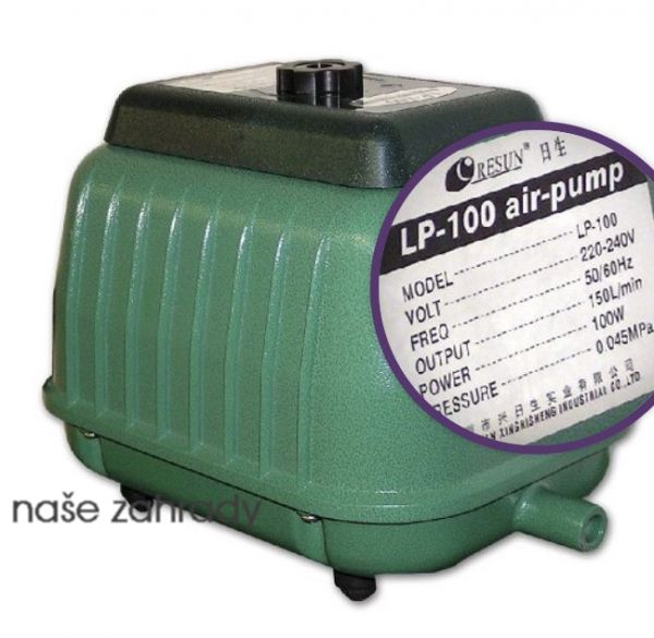 Vzduchovací kompresor Resun LP-100, 8400 l/h pro použití v akvaristických obchodech, pěstírnách, rybníčcích a líhních. Výhodou LP-100 je relativně bezhlučný provoz - výborný poměr výkon/cena - ekonomický provoz - moderní design - bezolejové mazání, výkonné s dlouhou životností - dvojitý tlumící skelet, hospodárný motor vyhovující ekologickým požadavkům. Membránová dmychadla ("želvy") jsou novou generací estetických a vysoce funkčních vzduchovadel s prakticky neomezenou dobou života. Nemají žádné kluzné nebo třecí plochy, které by se časem opotřebovaly. Pohyblivé gumové komponenty (vydrží min. 25 až 30 tis. hodin provozu) jsou lehce a levně vyměnitelné.