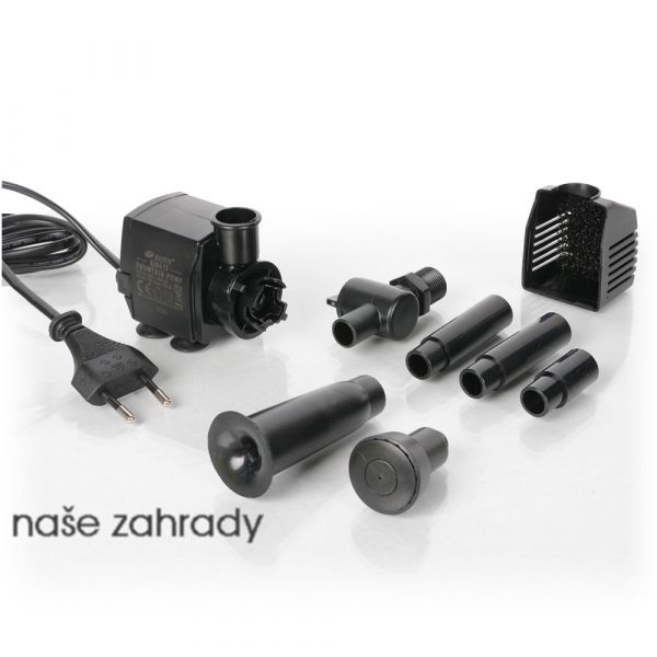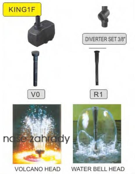 Jezírkové čerpadlo KING 1F 380 l/h s fontánovými nástavci pro použití na malé fontány do nádoby, na terase, v hale, na zahradě nebo v akvaristice nejen na slanou vodu. Víceúčelové čerpadlo do mini jezírka King se uplatní např. pro jezírka PVC, vytvoření fontánky na terase, do malého plastového jezírka a na mořskou vodu. Fontánové čerpadlo King 1F lze instalovat ve vodorovné i svislé poloze. Fontánový nástavec umožňuje jen velmi malý ponor. Čerpadlo pracuje ponořené, ale pokud je protékající vodou dostatečně chlazeno, je možné ho použít i vně nádrže. Při instalaci mimo nádrž musí být níže, než je vodní hladina, neboť není samonasávací. Voda do čerpadla pro jezírka musí natéci sama a tak ho také chladit. Na výstup čerpadla do jezírka lze připojit běžné výustky (závit, hadicovou sponu). Po sejmutí filtrační náplně s krytem lze k čerpací jednotce připojit i vstupní hadice, čímž lze použít čerpadlo i pro vnější přečerpávání. Čerpací jednotka má keramickou osu rotoru a keramické vypouzdření - je možné použití jako čerpadlo pro sladkou vodu, čerpadlo na mořskou vodu.Kovová část rotoru je potažena plastem. Určeno pro nástavce V1 - 3/8", R1 -3/8". Je vybaveno fontánovými nástavci. Inovací čerpadla došlo ke snížení spotřeby z 7W na 5W při zachování max. průtoku i dopravní výšky vody.