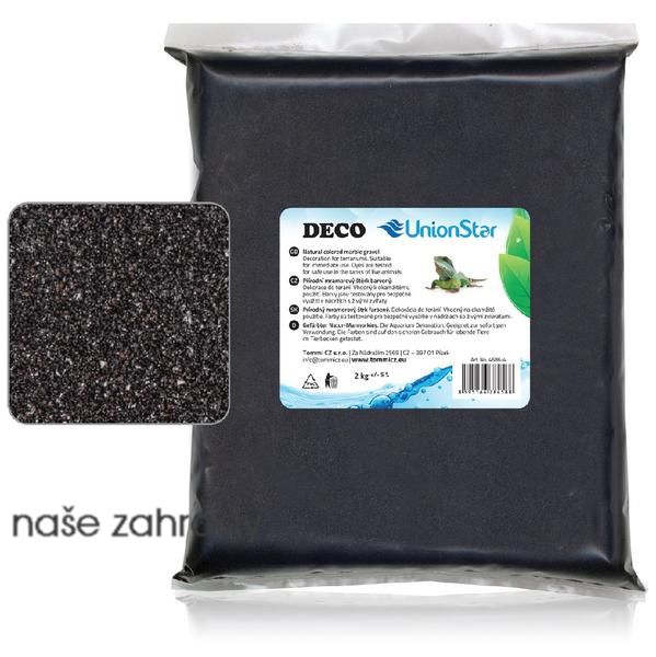 UnionStar písek do terária DECO 2kg v černé barvě, jemný. Terarijní písek se používá pro různá pouštní terária. Je barven trojí vrstvou certifikované barvy vhodné pro použití v teráriích. Neškodí živočichům ani rostlinám.
