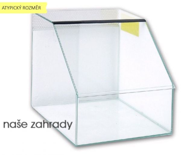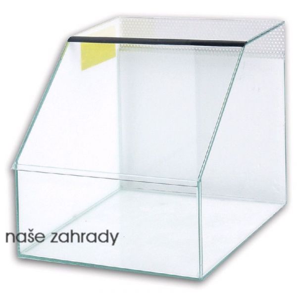 Skleněné terárium s šikmou čelní stěnou. Terárium skosené o rozměrech 20x20x20cm.