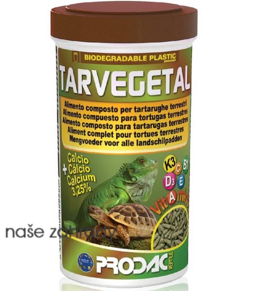 Krmení Prodac Tarvegetal 1200ml jsou pelety pro plazy a želvy. Kompletní krmivo Prodac Tarvegetal 260g je vhodné ke každodennímu krmení. Obsahuje protejny, vlákninu, vápník, fosfor a je obohaceno o vitamíny.