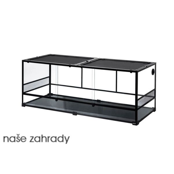 • Boční stěny a horní část terária jsou vyrobeny z ocelové síťky, která nebrání průniku světla a tepla, zadní část a dno jsou skleněné