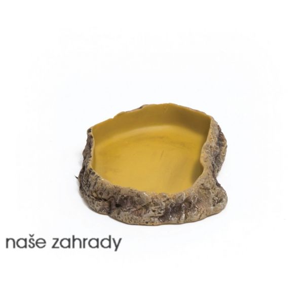 ReptiZoo terarijní miska na krmivo velikosti S. Miska na krmení byla vyrobena z bezpečného polyresinu. Povrchová úprava připomíná přírodní dekoraci, kámen, skalku, apod. Misky jsou tvarovány odlitím ve formách a jsou mimořádně odolné.