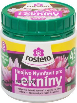 Nymfavit Rosteto 450g, 45 tablet pro nádherné lekníny ve Vašem jezírku. Speciální hnojivo v tabletách pro lekníny se pomalu rozpouští a dodává rostlinám v rybníčku potřebné živiny. Nymfavit Rosteto je speciální pomalu rozpustné hnojivo v tabletách pro dlouhodobé individuální hnojení a přihnojování leknínů. Hnojivo uvolňuje živiny po dobu až 8 měsíců. Balení obsahuje cca 45 ks tablet.